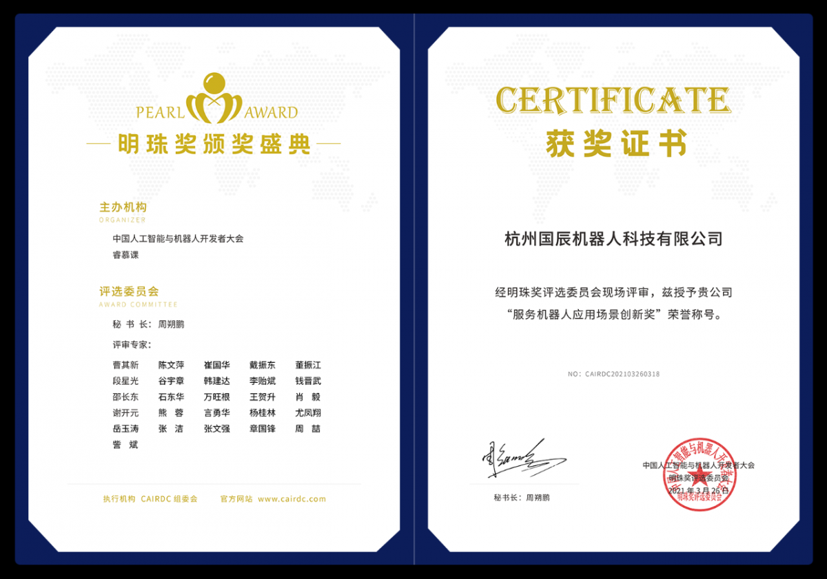 3月26日,第四屆中國(guó)人工智能與機(jī)器人開發(fā)者大會(huì)暨長(zhǎng)三角G60科創(chuàng)走廊洞涇人工智能全產(chǎn)業(yè)鏈大會(huì)在上海盛大召開,此次參會(huì)總?cè)藬?shù)超1300人,峰會(huì)期間,備受行業(yè)矚目的2021年“明珠獎(jiǎng)”也在會(huì)中正式揭曉,綜合產(chǎn)品技術(shù)創(chuàng)新、品牌實(shí)力等多方因素,杭州國(guó)辰機(jī)器人科技有限公司于70多家申報(bào)單位中脫穎而出,榮獲 “服務(wù)機(jī)器人應(yīng)用場(chǎng)景創(chuàng)新獎(jiǎng)”。